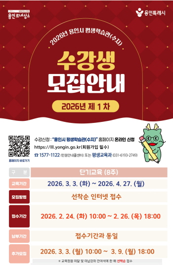 용인특례시(시장 이상일)는 24일부터 26일까지 수지구에 있는 용인시평생학습관에서 제1차 단기 교육 프로그램 수강생을 모집한다고 13일 밝혔다.