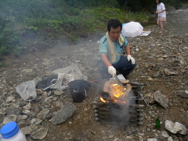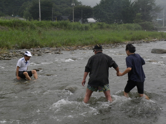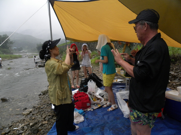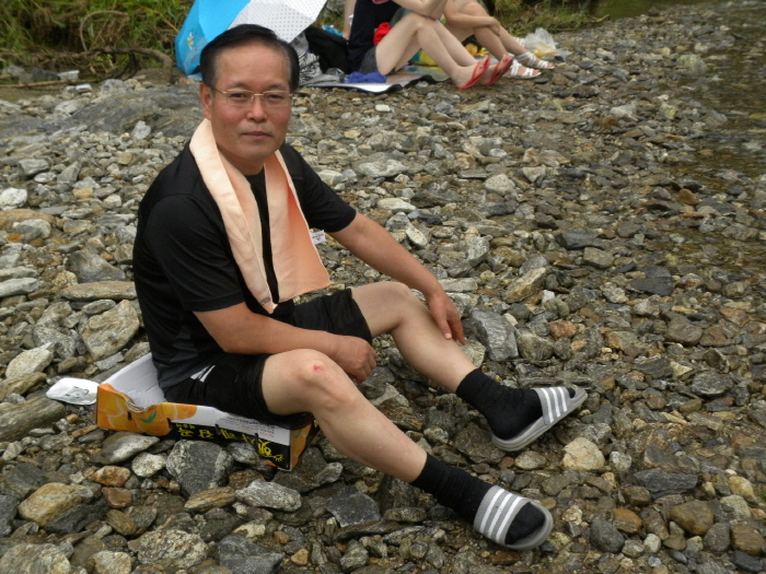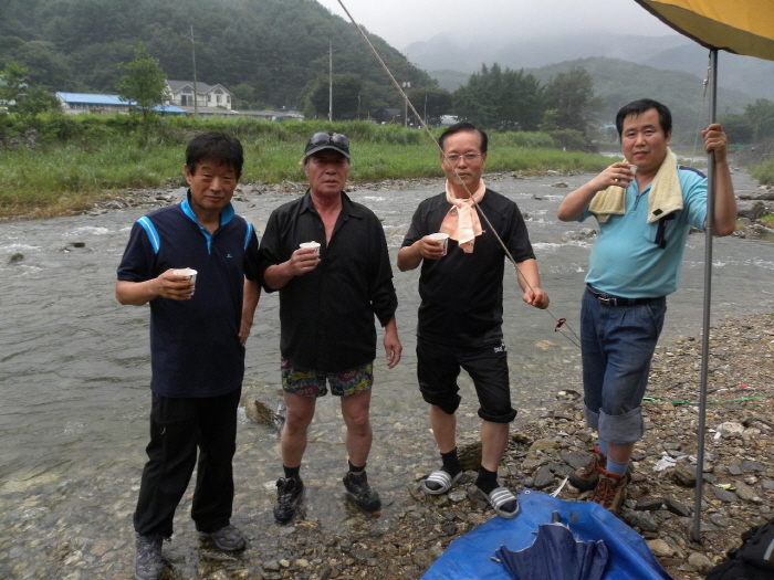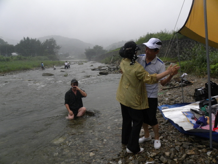 하루종일 보슬비가 내렸지만 오전 엔 남양주에있는 경기도 문화재 한북정맥 문화답사를 2군데 둘러보고 수동계곡으로 출발 빽곡히 줄지어 승용차들은 도로변에 세워있고 조금 올라가다보니 맑은물이흐르는 자리좋은곳이 눈에띄워 길가에 차를세워놓고 물가에 내려가 자리를 잡았다.