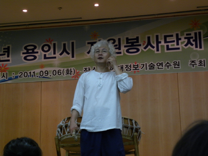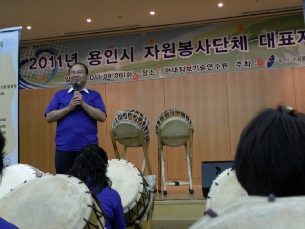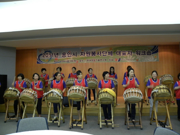 지난 9월6일 용인시 기흥구 마북동 현대정보기술연구소 에서 용인시 자원봉사단체 대표자 워크샾을 자원봉사센터 주차장에서 8시40분출발해 오전 9시30분 도착 60개 단체가 단체장 소개를 마친후 이성록 명사특강을 11시 30분까지 하고 점심식사 부페를 먹은후 소통의장 난타를 3시간정도 연습을하고 앞에나가 발표를 하였다.