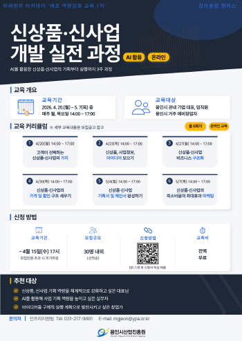 -AI 활용 기획부터 사업화까지…제조 역량 강화 위한 실무교육 본격 추진-용인시산업진흥원(이사장 이상일,이하 진흥원)은 관내 기업 및 예비창업자의 제조 역량 강화를 위한「신상품?신사업 개발 실전 과정(AI 활용)」교육생을 모집한다고 밝혔다.이번 교육은 진흥원이 올해 새롭게 추진하는‘미래창의 아카데미’의 첫 번째 운영 과정으로,지역 제조기업이 제품 기획부터 …