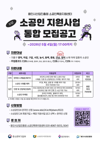 2026년 소공인특화지원센터 지원사업 통합 모집공고 포스터(용인시산업진흥원).jpg 3718498577_1776649959.11.jpg](http://www.yongintv.co.kr/data/editor/2604/3718498577_1776649959.11.jpg)