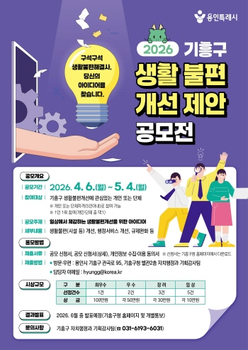 - 5월 4일까지 일상 속 생활불편 발굴·개선 제안 공모 -용인특례시(시장 이상일) 기흥구는 오는 6일부터 5월 4일까지 ‘2026 기흥구 생활불편개선 제안 공모전’을 개최한다. 이번 공모전은 일상에서 시민이 직접 체감하는 불편사항을 발굴하고, 이를 개선할 수 있는 다양한 방안을 모색하고자 마련됐다. 주제는 일상생활에서 체감하는 생활 불편 개선 아이디어다.…