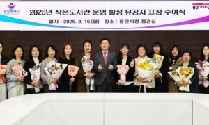- 16일 작은도서관 운영?발전 기여 개인?단체 등 표창 수여 -용인특례시(시장 이상일)는 16일 시장 접견실에서 ‘2026년 작은도서관 운영 활성 유공자 표창 수여식’을 개최했다.이날 표창은 지역 독서문화 확산과 작은도서관 운영과 발전에 기여한 개인과 단체의 노고를 격려하고자 마련됐다.표창 대상은 2년 이상 작은도서관 운영과 발전에 기여한 자원봉사자 개인 9명과 단체 5팀 등이다.이상일 시장은 “용인의 독서율은 54%로 전국 평균인 38.5%…