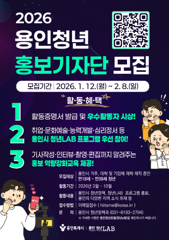 용인특례시(시장 이상일)는 2월 8일까지 청년의 시각으로 시정과 지역 소식을 전하는 ‘용인청년 홍보기자단’을 모집한다고 14일 밝혔다.