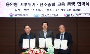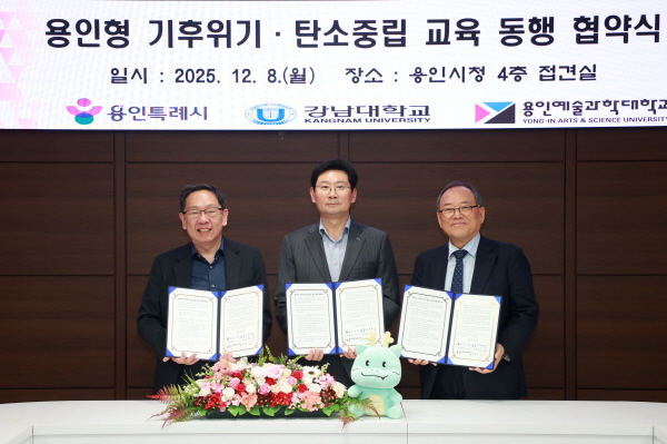 용인특례시(시장 이상일)는 8일 시청 접견실에서 강남대학교, 용인예술과학대학교와 ‘용인형 기후위기·탄소중립 교육 동행 협약’을 체결했다.