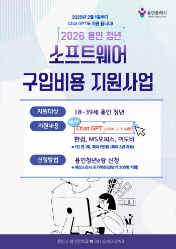용인특례시(시장 이상일)는 청년들의 디지털 역량 강화를 위해 ‘청년 소프트웨어 구입비용 지원사업’ 대상 품목에 ‘ChatGPT Plus’를 추가했다고 2일 밝혔다.