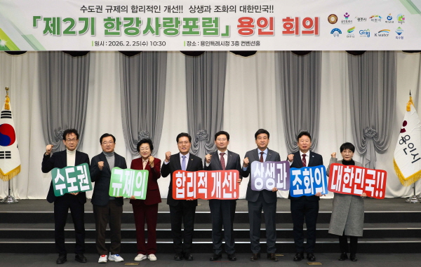 - 25일 용인시청 컨벤션홀에서 제2기 ‘한강사랑포럼’ 개최…용인·광주·이천·가평·하남 등 수도권 지자체장, 국회의원, 시민단체 대표 참석- 수도권 규제 합리적 개선 방안 논의…3월 중 토론회·공동 기자회견 추진키로 뜻 모아 -용인특례시(시장 이상일)는 25일 시청 컨벤션홀에서 ‘제2기 한강사랑포럼’을 개최하고, 한강유역 수도권 규제의 합리적 개선과 지역 간 상생 협력 방안을 논의했다고 밝혔다.이번 회의는 수도권 지역 간 협력을 바탕으로 자연보…