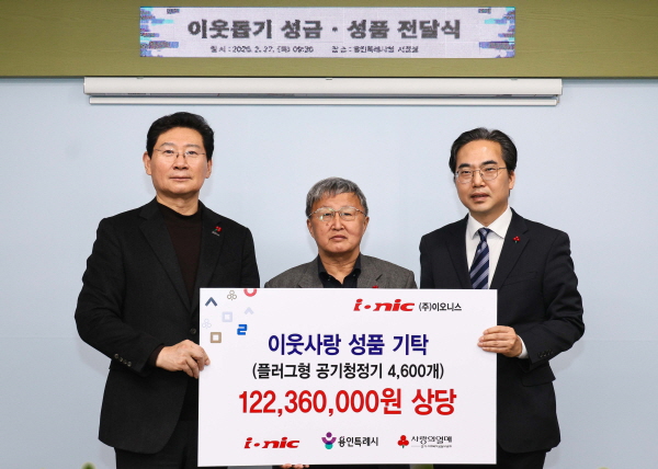 - 공기청정기 4600대, 성금 200만 원 등 1억 2000만 원 상당 성품?성금 기탁 -용인특례시(시장 이상일)는 27일 ㈜이오니스 등 2개 기업이 1억 2000만 원 상당의 성품과 성금을 기탁했다고 밝혔다.이날 ㈜이오니스 등 2개 기업은 시청 시장실에서 이상일 시장을 만나 어려운 이웃을 위해 사용해달라며 성품과 성금을 전달했다.㈜이오니스는 공기청정기 4600대(1억 2000만 원 상당)를, 브랜드 ‘시원하당’을 보유한 한 업체도 성금 20…