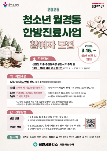 용인특례시(시장 이상일)는 청소년들의 건강한 성장을 돕기 위해 ‘청소년 월경통 한방진료 지원사업’을 실시한다고 10일 밝혔다.