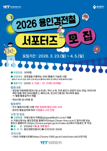 - 개인 SNS 통해 경전철 매력 홍보…4월 5일까지 전자우편으로 신청 접수 - 용인특례시(시장 이상일)는 4월 5일까지 용인의 대표적인 철도인 용인경전철을 활성화하고자 ‘용인경전철 서포터즈’를 모집한다고 23일 밝혔다. 서포터즈는 경전철 이용객의 시각으로 경전철 이용 정보, 경전철 주변 관광지?맛집, 지역 행사 등을 사진?글?영상 콘텐츠로 제작해 블로그, 페이스북, 인스타그램 등 개인 사회관계망서비스(SNS)를 통해 알린다.지원 자격은 용인경…