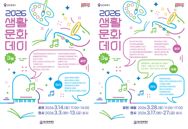 - 3월 둘째 주와 넷째 주, 생활문화동호회 공연·체험 프로그램 운영 -- 3월 3일부터 2분기 생활문화센터 정기대관 신청 접수 시작-용인문화재단은 오는 3월 14일과 28일 보정역 생활문화센터에서 ‘3월 생활문화데이’를 개최한다고 밝혔다.‘생활문화데이’는 보정역 생활문화센터를 대관하여 활동하는 생활문화 동호회원들이 시민을 대상으로 공연·전시·체험 프로그램…