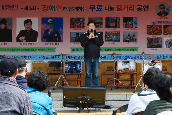 - 이상일 시장 “장애?비장애 경계 넘어 따뜻한 공동체 밑거름 되길 바란다” - 이상일 용인특례시장은 27일 용인실내체육관에서 열린 ㈔한국장애인문화협회 용인시지부(지부장 전욱재) 주관 ‘제5회 장애인과 함께하는 무료나눔 버스킹공연’을 찾아 관계자와 참석자를 격려했다. 이날 행사에는 이상일 시장과 장애인, 장애인 가족 약 400명이 참석했다. 이상일 시장은 “오늘 행사가 문화예술을 통해 서로를 이해하고 소통하며 장애와 비장애의 경계를 넘어 모두가…