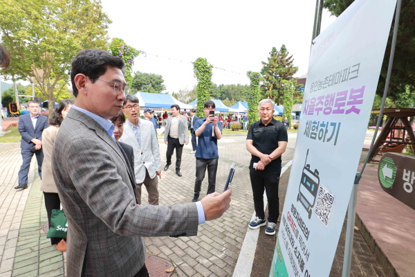 용인그린대학 행사 후 이상일 시장은 용인농촌테마파크에 마련된 자율주행로봇 실증사업 현장을 점검했다.