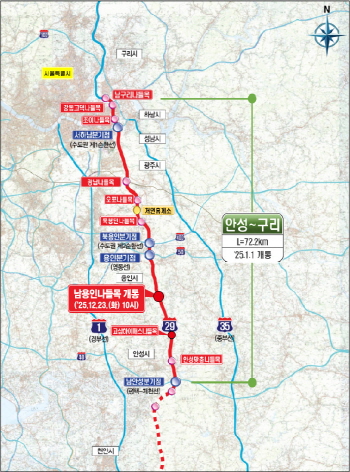 안성~용인~구리 구간(72.2㎞)은 1월 1일 개통됐다. 이 가운데 처인구 모현읍에서 원삼면까지 용인을 남북으로 관통하는 구간의 길이는 26㎞다. 포천~구리 구간(44.6㎞)은 지난 2017년 개통됐고, 안성~세종 구간(59.5㎞)은 2026년 말 개통 예정이다.
