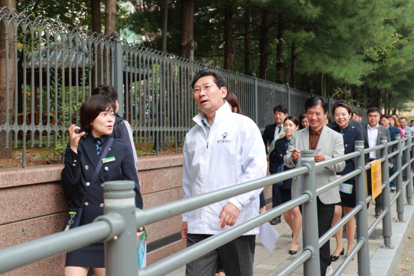 이 시장은 학부모들과 함께 통학로 주변을 둘러보며 시설을 점검하면서 ▲대청초 후문 좁은 인도에 풀이 우거져 보행을 방해하는 화단과 파손된 보도블록 정비 ▲인도와 차도의 경계가 없는 구간 볼라드 설치 ▲진흥더블파크 옆 가파른 경사와 급커브 구간 방지턱 추가 설치 ▲학교 주변 일부 보도블럭 교쳬 등을 지시했다.