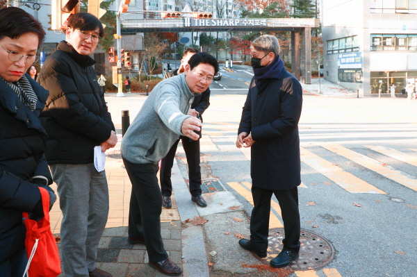 상현초는 통학로 범위가 넓고 횡단보도 숫자도 많은 학교로, 이 시장은 여러 지점을 직접 둘러보며 위험 요소와 개선이 필요한 사항을 꼼꼼히 확인했다.