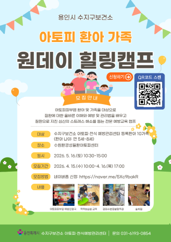 용인특례시(시장 이상일) 아토피·천식 예방관리센터는 아토피피부염 환아와 가족을 위한 ‘아토피 환아 가족 원데이 힐링캠프’ 참가자를 모집한다고 15일 밝혔다.